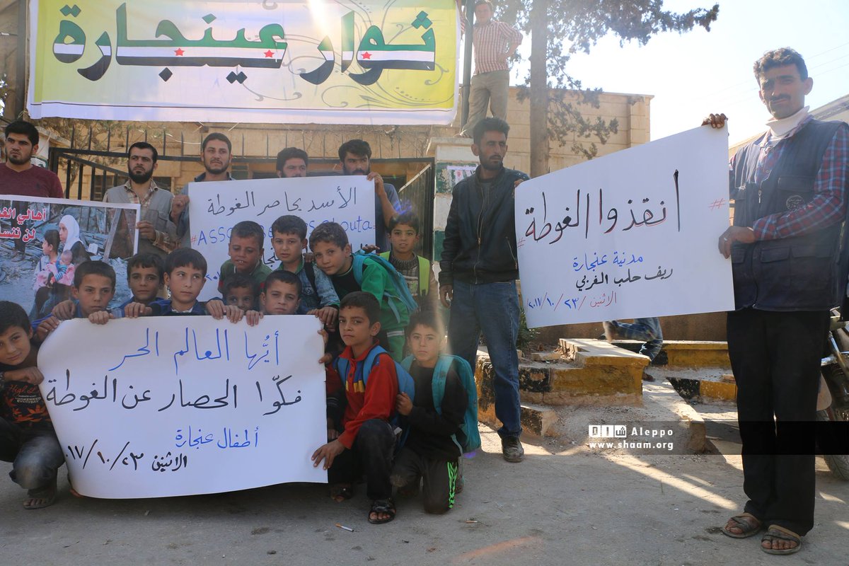 وقفة لأهالي بلدة #عنجارة في ريف #حلب الغربي، بالتزامن مع حملة #الأسد_يحاصر_الغوطة، تضامناً مع الغوطة الشرقية المحاصرة #سوريا